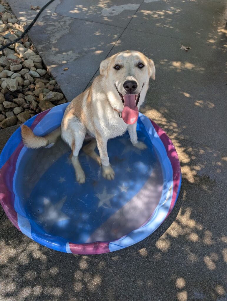 Joy is friendly with everyone she meets and does well with other dogs. She’s curious about the goats at the rescue but has shown no aggression toward them. She has not yet been tested with cats.
